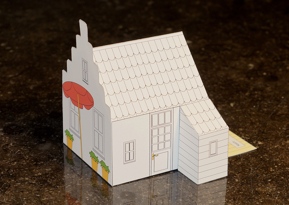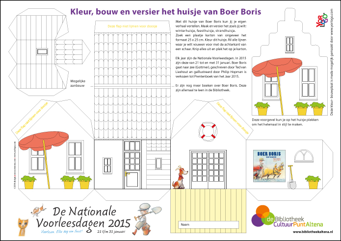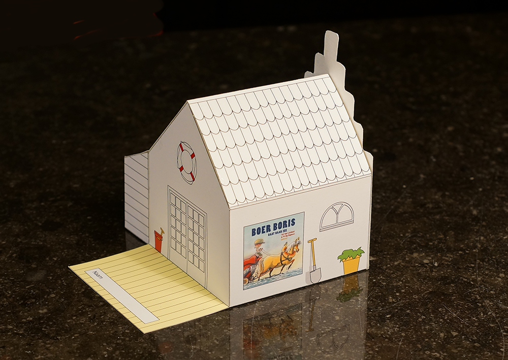 Deze kleur- en bouwplaat is een gefantaseerd huisje van Boer Boris. De kinderen kunnen hiermee hun eigen verhaal maken. Als strandhuisje met schelpjes, veertjes en takjes etc. etc. Maar het kan net zo goed een woonhuis of een boerderij worden. Het dak kan open, dus er kunnen ook nog dingen in opgeborgen worden, om het extra spannend te maken. Hoe de invulling van tekst en logo is bepaalt u!